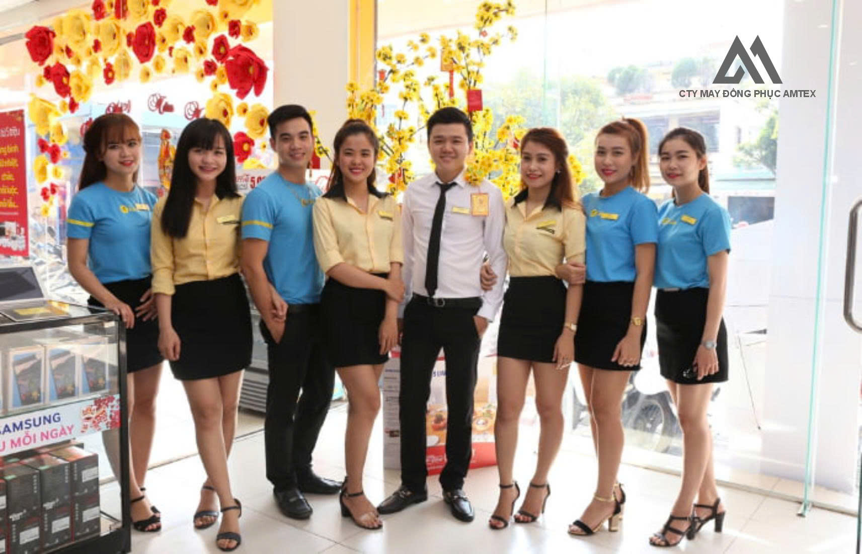 Đối với Nữ: Phối hợp cùng chân váy bút chì hoặc chân váy chữ A màu đen ngắn trên gối. Cách phối này giúp tôn lên vẻ nữ tính, năng động và rất thuận tiện cho việc di chuyển trong cửa hàng.