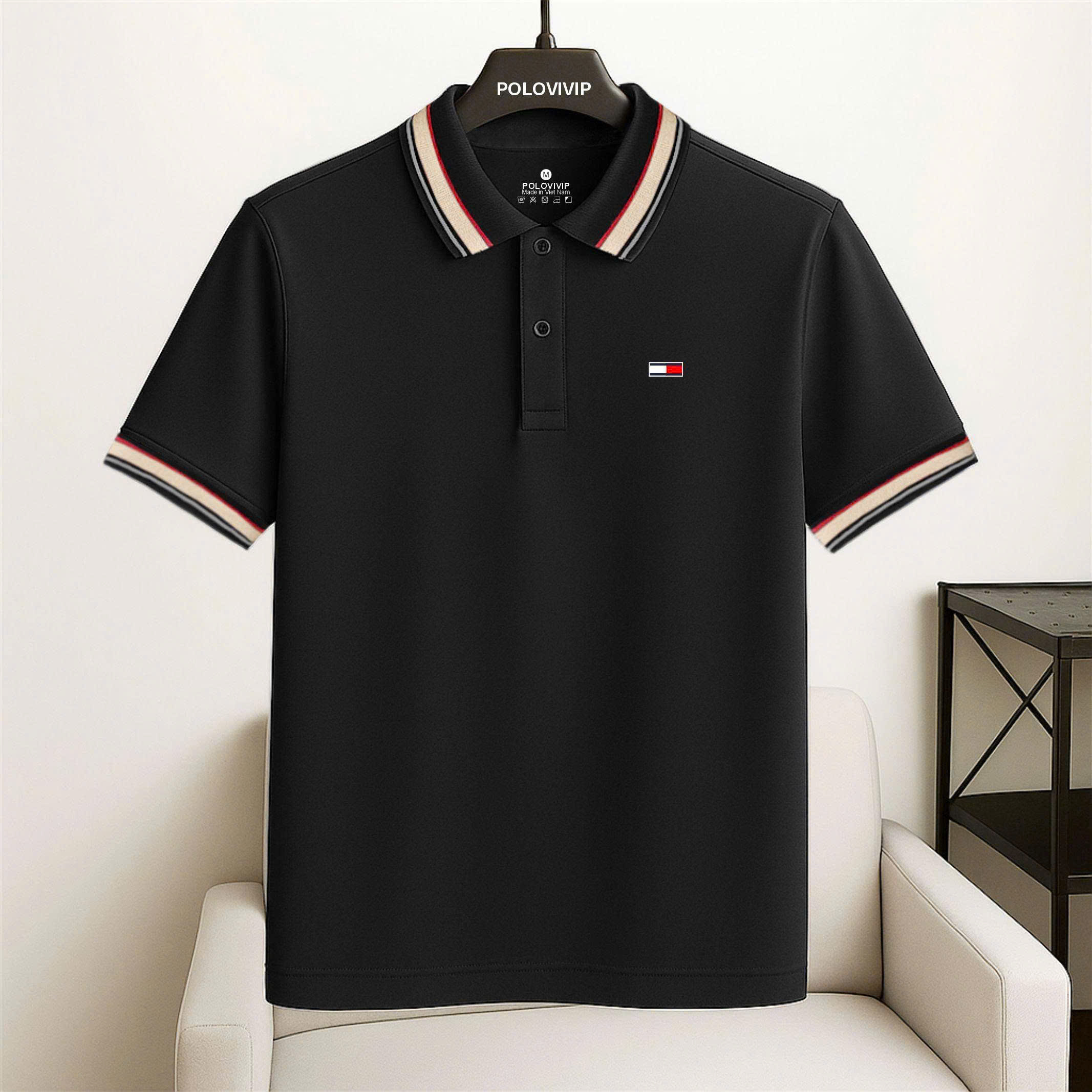 Thiết kế viền phối ấn tượng: Điểm nhấn của sản phẩm nằm ở phần bo cổ và bo tay được dệt phối sọc ba màu (be, trắng, đỏ) trên nền đen. Chi tiết này tạo nên nét chấm phá hiện đại, mang hơi hướng thể thao nhưng vẫn giữ được sự chỉn chu cần thiết.